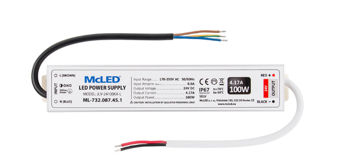 LED napěťový zdroj pro LED pásky 100W, krytí IP67, výstup 24VDC, 4,17A. Vstup: 170-250VAC, 50-60Hz, účinnost > 90%, materiál krytu: hliník. Rozměry: 218x40x22mm, hmotnost: 390g. Zdroj SELV. Při výběru zdroje počítejte s výkonovou rezervou min. 20%.