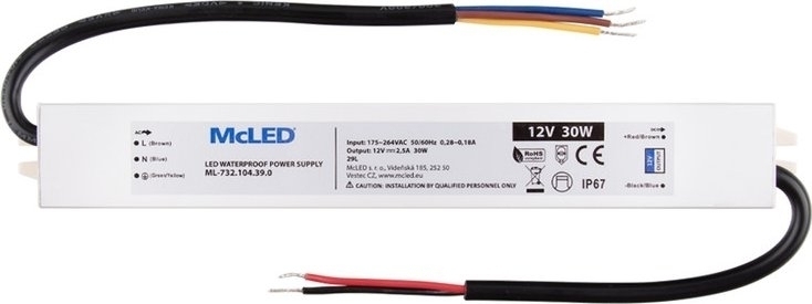 Zdroj konstantního napětí, výkon 30W, krytí IP67, výstup: 24VDC, max. 1,25A. Vstup: 175-264VAC, 50-60Hz, materiál krytu: hliník. Rozměry: 188x29x20mm, hmotnost: 226g. Zdroj SELV. Při výběru zdroje počítejte s výkonovou rezervou min. 20%.