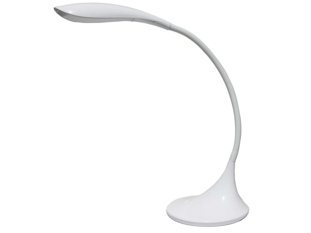 Dotyková LED stolní lampa. Díky ohebnému ramenu se dá lampa natáčet dle potřeby. Dotykový stmívač umožňuje nastavit tři úrovně intenzity osvětlení.