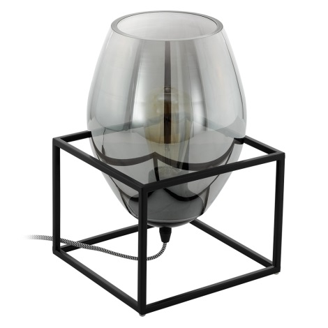 Originální stolní svítidlo vhodné do moderního interiéru. Černá kovová základna, uvnitř skleněné svítidlo z lesklého kouřového skla. Dotvoří intimní atmosféru v místnosti, ať už to bude obývací pokoj, pracovna, chodba nebo ložnice. Ovládá se kolébkovým vypínačem na přívodním kabelu. Zdroj není součástí balení. Zde si můžete zakoupit vhodný LED úsporný zdroj.