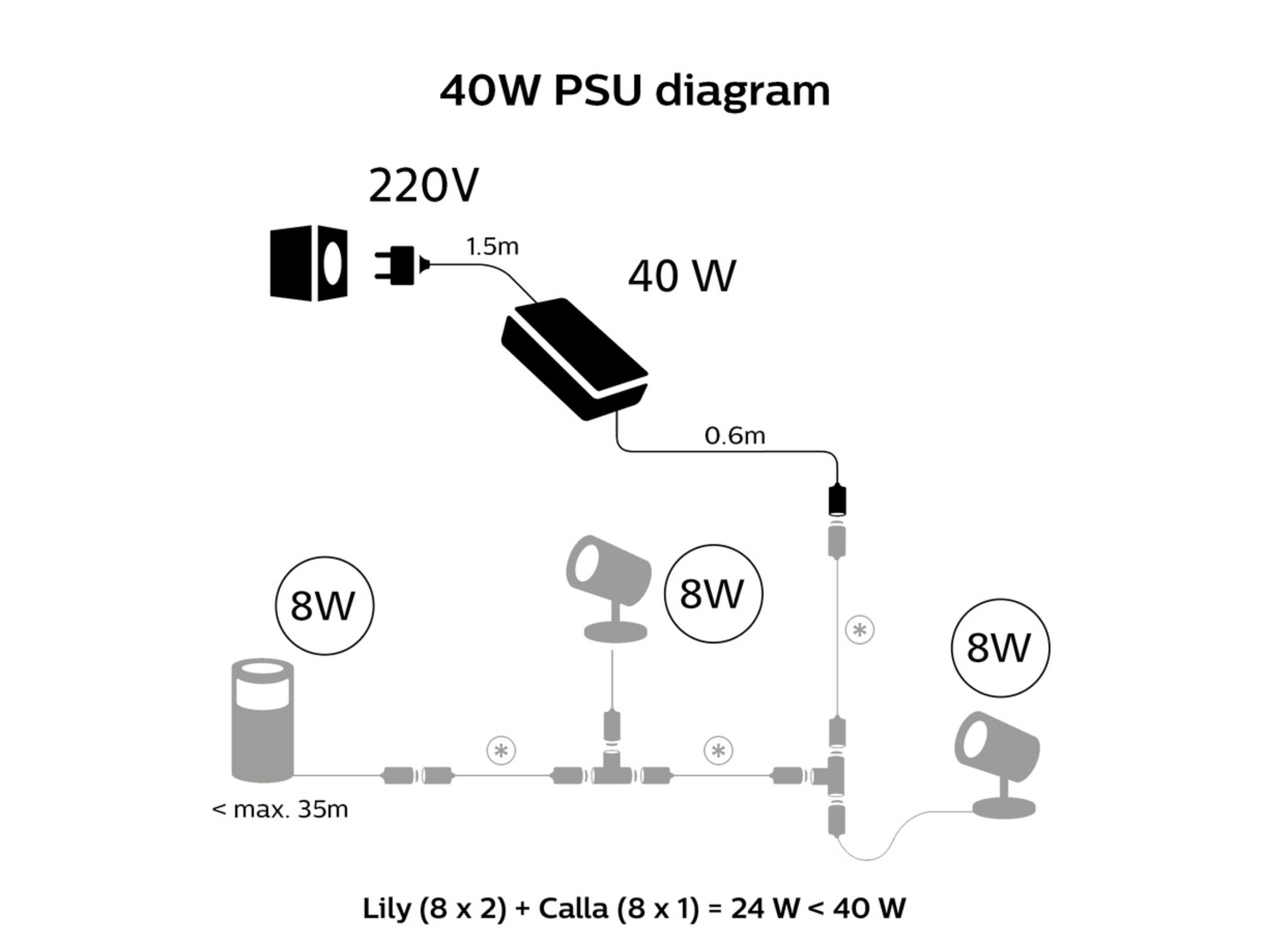 Venkovní napájecí jednotka Philips Hue 40W je klíčovým prvkem pro provoz nízkonapěťového systému venkovního osvětlení Philips Hue (24 V). Tento kompaktní a výkonný zdroj umožňuje připojit a napájet více svítidel najednou až do celkového příkonu 40 W. Díky modulárnímu systému můžete vytvořit rozvod o délce až 35 metrů, což představuje flexibilní řešení pro osvětlení okolí domu, zahrady, příjezdových cest nebo teras bez nutnosti složitých elektroinstalačních prací.