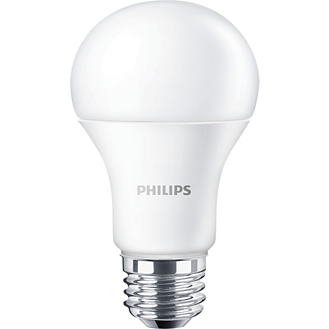 LED žárovka Philips CorePro s paticí E27 ve tvaru baňky A14 v matné bílé variantě FR o příkonu 10,5 W, která nahrazuje klasickou 75 W žárovku, svítí příjemně rozptýleným úsporným teplým bílým světlem 3000 K se světelným tokem 1055 lm.
