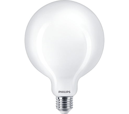 LED žárovka Philips globe s paticí E27 v kulovitém tvaru baňky G120 v matné bílé variantě o příkonu 13 W, která nahrazuje klasickou 120 W žárovku, svítí rozptýleným teplým bílým světlem 2700 K se silným světelným tokem 2000 lm.