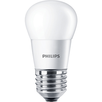 Lustrová LED žárovka Philips CorePro lustre s paticí E27 a mléčně bílou baňkou ve tvaru kapka P45 s příkonem 2,8 W nahrazuje obyčejnou 25 W žárovku a vydává příjemně rozptýlené nestmívatelné teplé bílé světlo 2700 K se světelným tokem 250 lm.