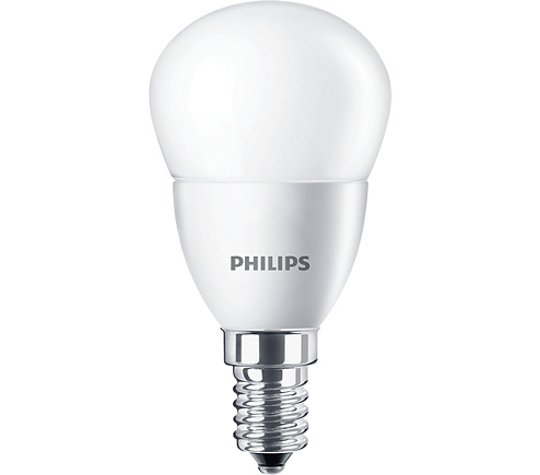 LED žárovka Philips CorePro luster s paticí E14 ve tvaru baňky P48 v matné bílé variantě FR o příkonu 4 W, která nahrazuje klasickou 25 W žárovku, svítí příjemně rozptýleným úsporným teplým bílým světlem 2700 K se světelným tokem 250 lm.