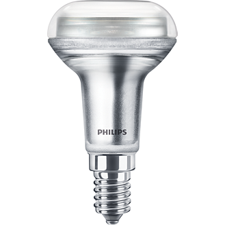 LED žárovka Philips CorePro s paticí E14 ve tvaru baňky R50 v matné variantě o příkonu 2,8 W, která nahrazuje klasickou 40 W žárovku, svítí úsporným teplým bílým světlem 2700 K se světelným tokem 210 lm.