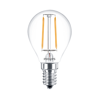 LED žárovka Philips filament Classic s paticí E14 ve tvaru baňky P45 v průhledné variantě o příkonu 2 W, která nahrazuje klasickou 25 W žárovku, svítí příjemně rozptýleným úsporným teplým bílým světlem 2700 K se světelným tokem 250 lm.