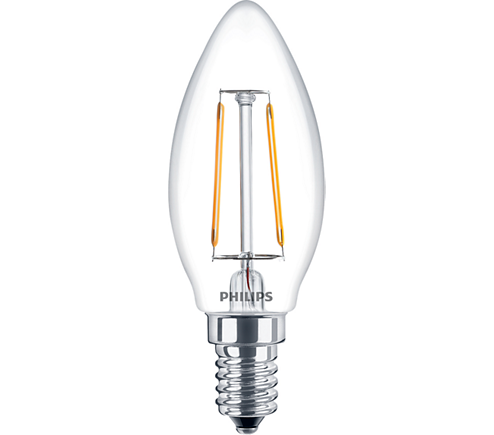 LED žárovka Philips Classic filament s paticí E14 ve svíčkovém tvaru baňky B35 v průhledné variantě o příkonu 2W, která nahrazuje klasickou 25 W žárovku, svítí úsporným teplým bílým světlem 2700 K se světelným tokem 250 lm.