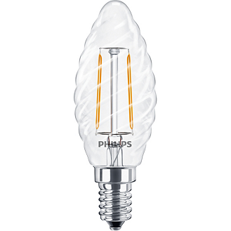 LED žárovka Philips filament s paticí E14 ve svíčkovém tvaru baňky ST3 v průhledné variantě o příkonu 2 W, která nahrazuje klasickou 25 W žárovku, svítí příjemně rozptýleným úsporným teplým bílým světlem 2700 K se světelným tokem 250 lm.