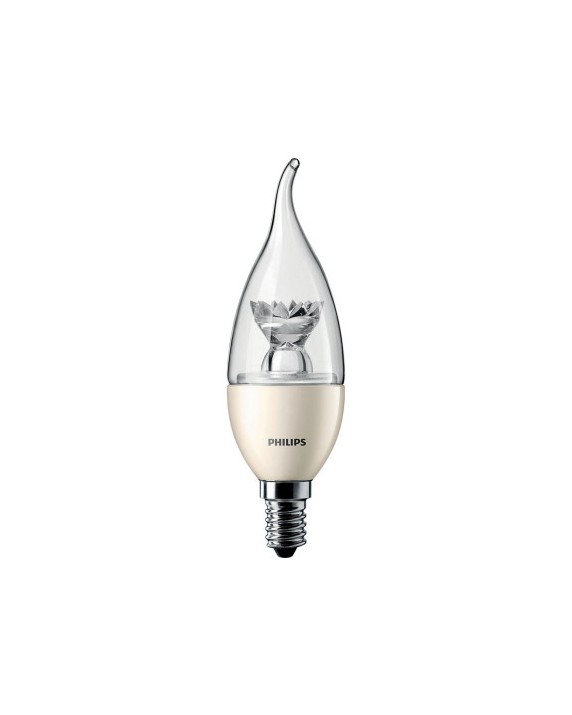 LED žárovka Philips MASTER s paticí E14 ve svíčkovém tvaru baňky BA39 v průhledné variantě o příkonu 3 W, která nahrazuje klasickou 25 W žárovku, svítí úsporným teplým bílým světlem 2700 K se světelným tokem 250 lm.