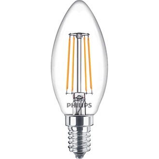 LED žárovka Philips Classic filament s paticí E14 ve svíčkovém tvaru baňky B35 v průhledné variantě o příkonu 4,3 W, která nahrazuje klasickou 40 W žárovku, svítí příjemně rozptýleným úsporným teplým bílým světlem 2700 K se světelným tokem 470 lm.