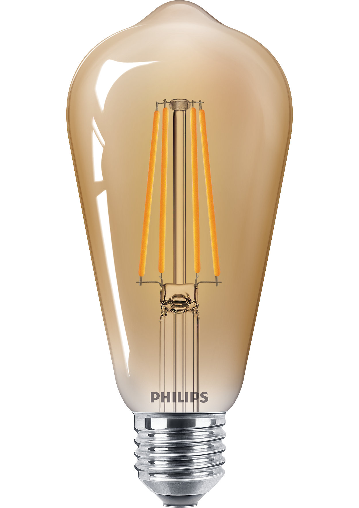 LED žárovka Philips Classic filament GOLD s paticí E27 ve tvaru baňky ST64 ve zlaté variantě o příkonu 5,5 W, která nahrazuje klasickou 48 W žárovku, svítí příjemně rozptýleným úsporným teplým světlem 2500 K se světelným tokem 600 lm.