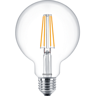 LED žárovka Philips Classic filament globe s paticí E27 v kulovitém tvaru baňky G93 v průhledné variantě o příkonu 7 W, která nahrazuje klasickou 60 W žárovku, svítí příjemně rozptýleným úsporným teplým bílým světlem 2700 K se silným světelným tokem 806 lm.