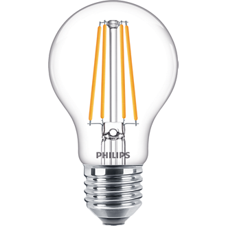 LED žárovka Philips Classic filament s paticí E27 v tradičním tvaru baňky A60 v průhledné variantě o příkonu 8,5 W, která nahrazuje klasickou 75 W žárovku, svítí příjemně rozptýleným úsporným teplým bílým světlem 2700 K se světelným tokem 1055 lm.