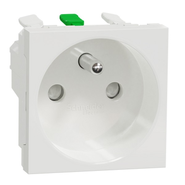 Zásuvka Schneider Electric Nová Unica. Zásuvka má bezšroubové připojení vodičů, zemnící kolík a ochranné clonky. Barevné provedení zásuvky NU305918E je bílá barva.