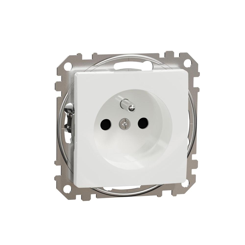 Zásuvka Schneider SEDNA SDD111012 jednonásobná s clonkami a ochranným kolíkem. Ideální pro instalaci do vícenásobného rámečku nebo rámečku libovolné barvy.